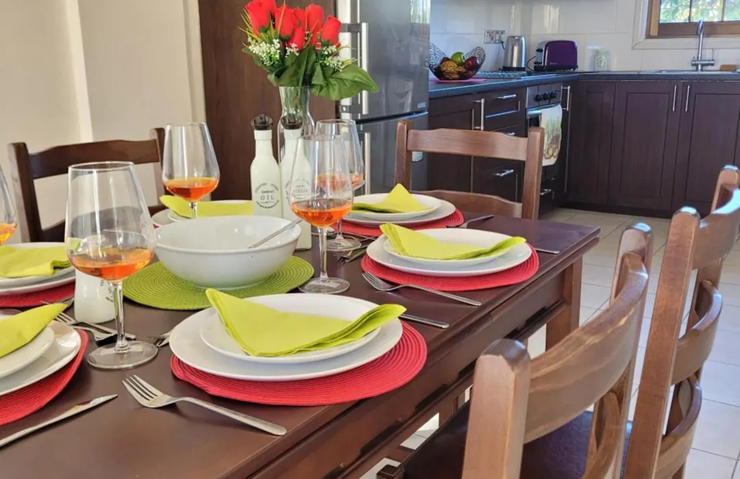 Εξοπλισμένη μικρή κουζίνα διαθέτει όλα τα απαραίτητα σκεύη και εξοπλισμό για μαγείρεμα, όπως φούρνος. Οι επισκέπτες μπορούν να γευματίσουν στο Nissaki Ayias Theklas Bar Restaurant, που βρίσκεται σε απόσταση μόλις 1 χλμ. Επίσης, δίπλα βρίσκεται στάση λεωφορείου Agia Thekla Tourist Area - 2nd, που είναι σε απόσταση 200 μέτρων. Όσοι προτιμούν αθλητικές δραστηριότητες μπορούν να ασχοληθούν με ιστιοσανίδα, κατάδυση και ποδηλασία.